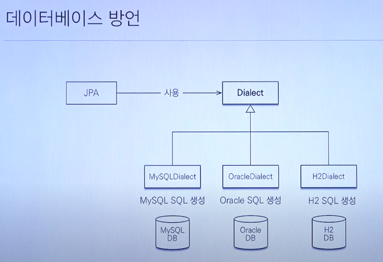 위에 설정에 보면 hibernate.dialect 설정을 하는데, Mysql, Oracle, Postgre 등등 SQL 마다 문법이 다르므로 데이터베이스 마다 변경해줄 필요가 있다. JPA는 특정 데이터베이스에 종속적이지 않으므로 dialect를 설정하므로써 설정한 데이터베이스의 SQL문을 생성해준다.(여기에서 각 SQL에 따른 설정을 확인 할 수 있다)