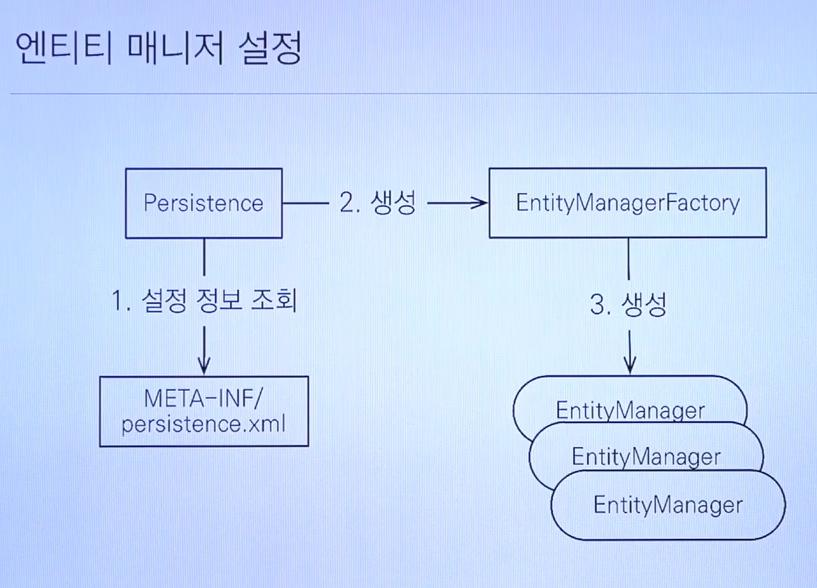 META-INF/persistence.xml에 설정한 값을 조회한 후 persistence에서 설정한 값을 Persistence.createEntityManagerFactory("hello")값을 통해 생성하여 EntityManagerFactory를 만든다.