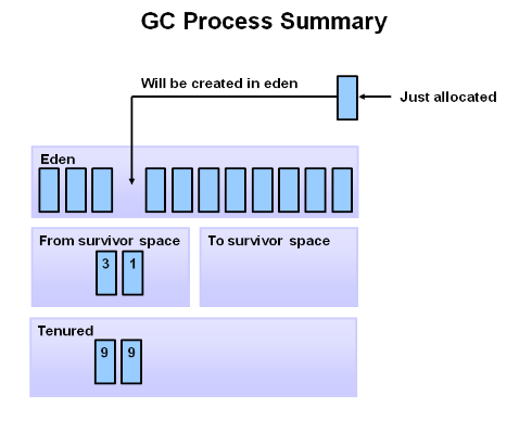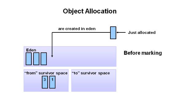- 새로운 객체가 생성되면 Eden 영역에 할당됩니다. 2개의 Survivor 영역은 모두 빈 상태로 시작합니다.