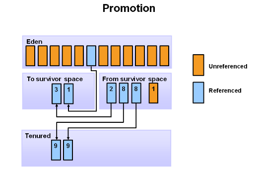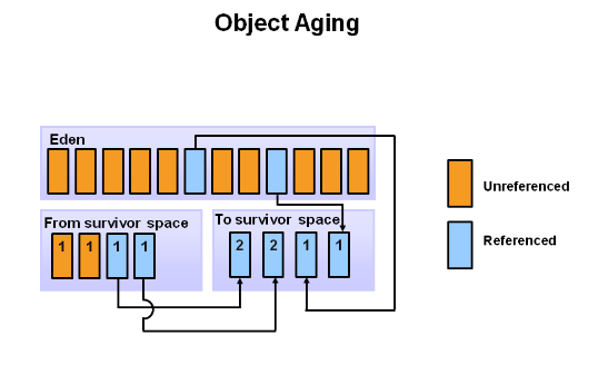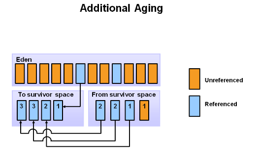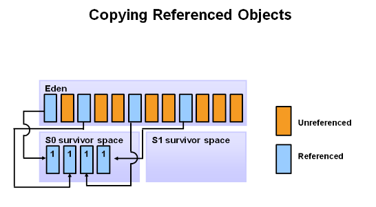 - 참조된 객체는 S0 Survivor space로 이동하고 참조되지 않은 객체들은 삭제됩니다.