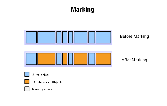 - Marking : Garbage Collector는 사용하는 객체와 사용하지 않는 객체를 식별하기 위해서 marking을 합니다.