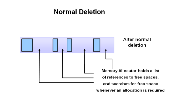 - Normal Deletion : 다음으로 참조되지 않은 객체들을 제거하고 참조하는 객체와 포인터를 여유 공간에 남겨둡니다.Memory Allocator는 새로운 객체가 할당될 수 있는 여유 공간 블록에 대한 참조를 보유합니다.